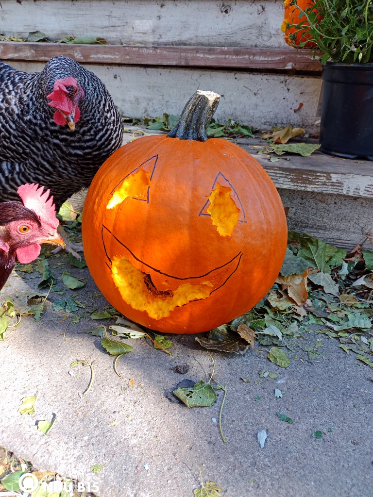 Chickens very first pumpkin carving they loved it! I drew the eyes & mouth stabbed it a couple times to get them started & let them go to town. They did a really good job! Who knew chickens love carving pumpkins ❤️